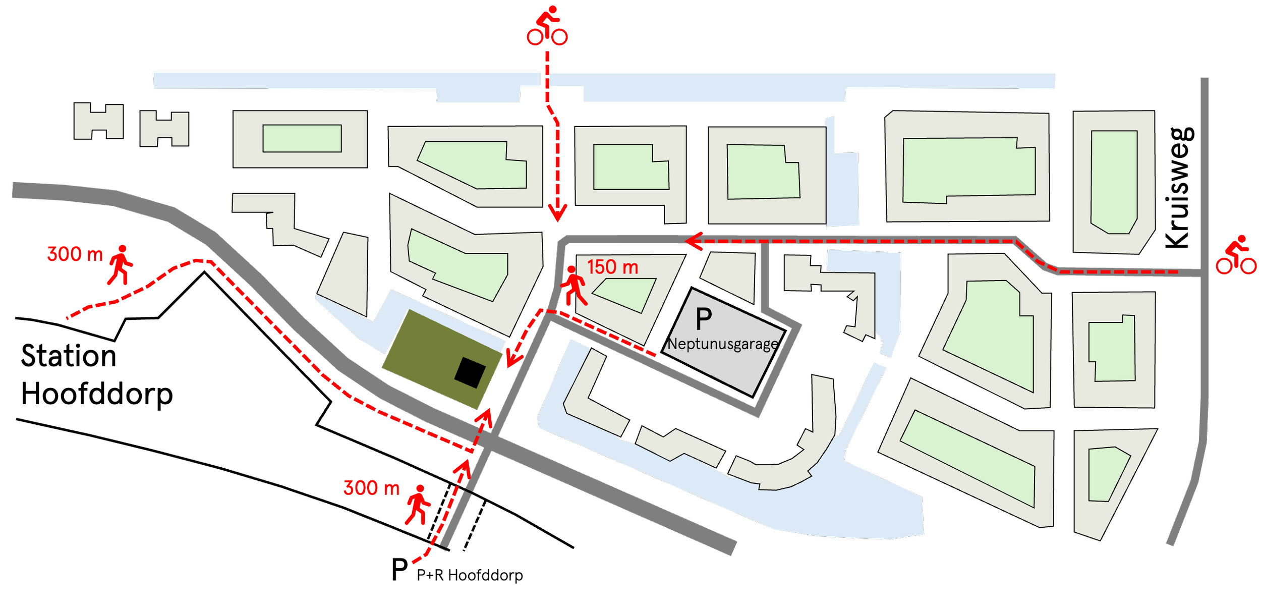Omdat dit gebied grootstedelijk wordt ingericht en erg goed bereikbaar is met het openbaar vervoer hebben we geen eigen parkeerplaatsen op ons terrein. Parkeren met de auto kan in meerder parkeergarages op loopafstand.